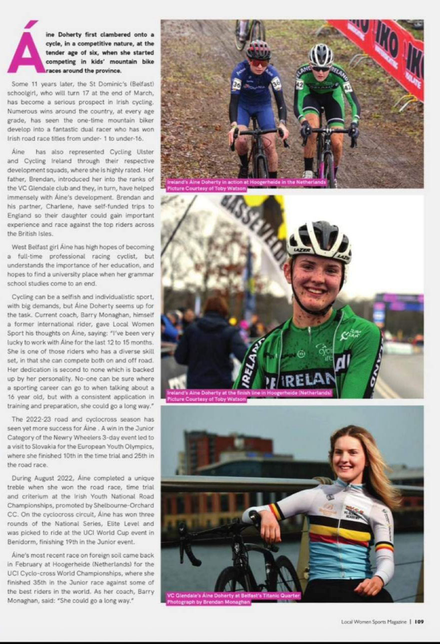 Yet again our very own Áine Doherty is making the headlines, featuring in Local Womens Magazine. Áine who only just turned 17 is certainly making waves for womens sport competing in multiple cycling disciplines at home and respresenting her country at World Championships and Youth Olympics, a home grown talent who no doubt will move into the professional ranks in the near future. Magazine issue is out on Friday https://localwomenmagazine.com/
